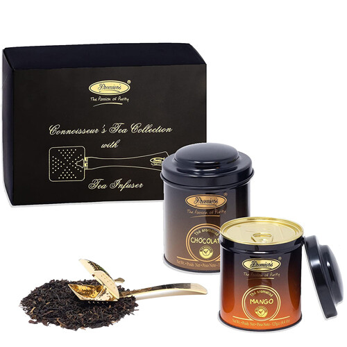 Presenting the 2 in 1 Gift Box Set of Original & Flavoured Teas from Premier’s, thoughtfully designed for tea connoisseurs. An ensemble of 2 premium quality loose leaf tea packed in elegantly designed round metal caddies, to add flavour to a special occasion with its refreshing aroma and heart-warming flavours. It comes in a beautifully designed paper board box making it an ideal choice for gifting. The Golden tea infuser included in the box is a perfect accessory that all tea lovers need.
